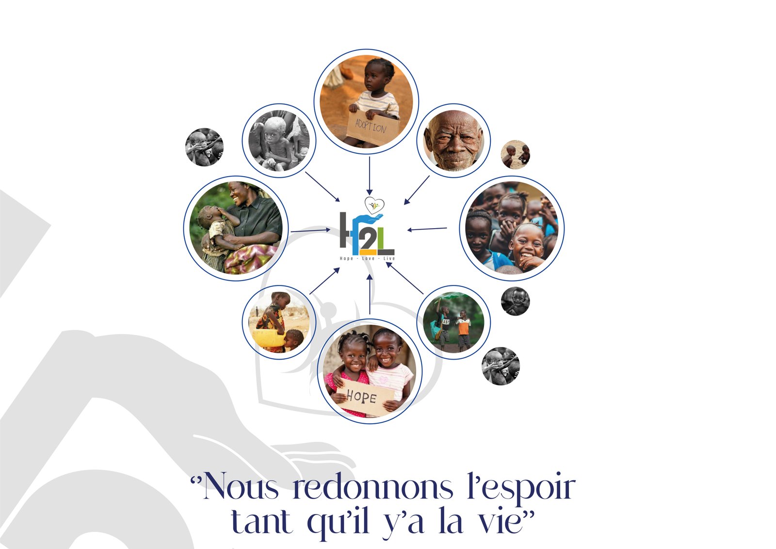L'ONGD H2L a comme missions, dans le cadre des actions humanitaires, sans que celle-ci soient limitatives: 1° Accompagner les actions socio-économiques du Gouvernement de la République visant (i) la réforme sociale sur la réduction des inégalités socio-économiques, (ii) la promotion des projets de protection sociale et (iii) la lutte contre toute forme de discrimination sociale. Notamment par l’assistance et l’encadrement : - des orphelins, et des veuves et veufs à leur développement ; - des jeunes par la formation à l’entrepreneuriat et à la gestion ; - des personnes vivant avec handicap. 2° Prendre en charge et accompagner les filles mères et les enfants abandonnés. 3° Encadrer les personnes vivant avec VIH/SIDA et leur reproduction. 4° Construire et/ou réhabiliter, avec le soutien des partenaires nationaux ou internationaux : - les Ecoles et les Collèges d’apprentissage des métiers ou des langues pour un relèvement de conscience et des compétences ; - les Hôpitaux et les Centres de santé ; - les Pharmacies pour des soins de santé primaires ; - les Homes des vieillards modernes et la création des Centres de prise en charge médicale des personnes de 3ème âge " la gériatrie". 5° Assister les enfants dans les différents centres d’hébergement et de détention (Prison) ainsi que les malnutris. 6° Créer les services de médecine d'urgence de proximité et les urgences pré et extra hospitalières. 7° Encourager la médecine préventive et promotionnelle par le changement de mentalité de la population. 8° Former les pairs éducateurs dans la prévention des maladies sexuellement transmissibles. 9° Promouvoir le respect du Droit de l’homme. 10° Faciliter l’accès aux familles les plus démunies à la nourriture par la production des denrées alimentaires.